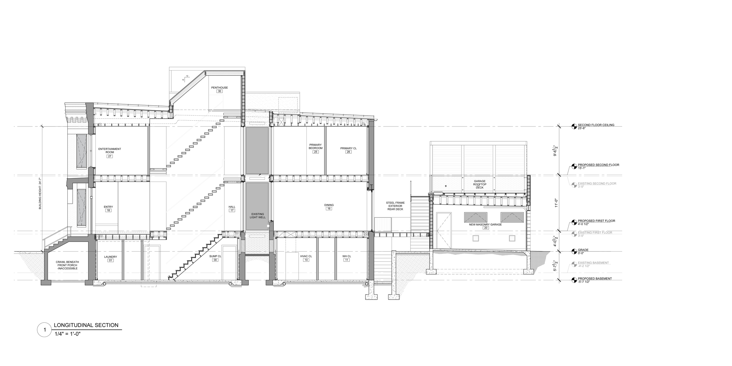 This 4,000-square-foot renovation reimagines an 1890s two-flat on a tighter-than-standard Chicago lot (24' x 94') into a creatively programmed live-work residence. The client brought us an ambitious brief: he desired a recording studio, home theater, gym, sauna, micro game room, spacious office to accommodate himself and staff, four full bathrooms, a guest room for visiting family, all within a historic shell. There are also two rooftop decks — one above the residence, and one above the garage, expertly weaving together three outdoor spaces between the rooftops and the backyard.