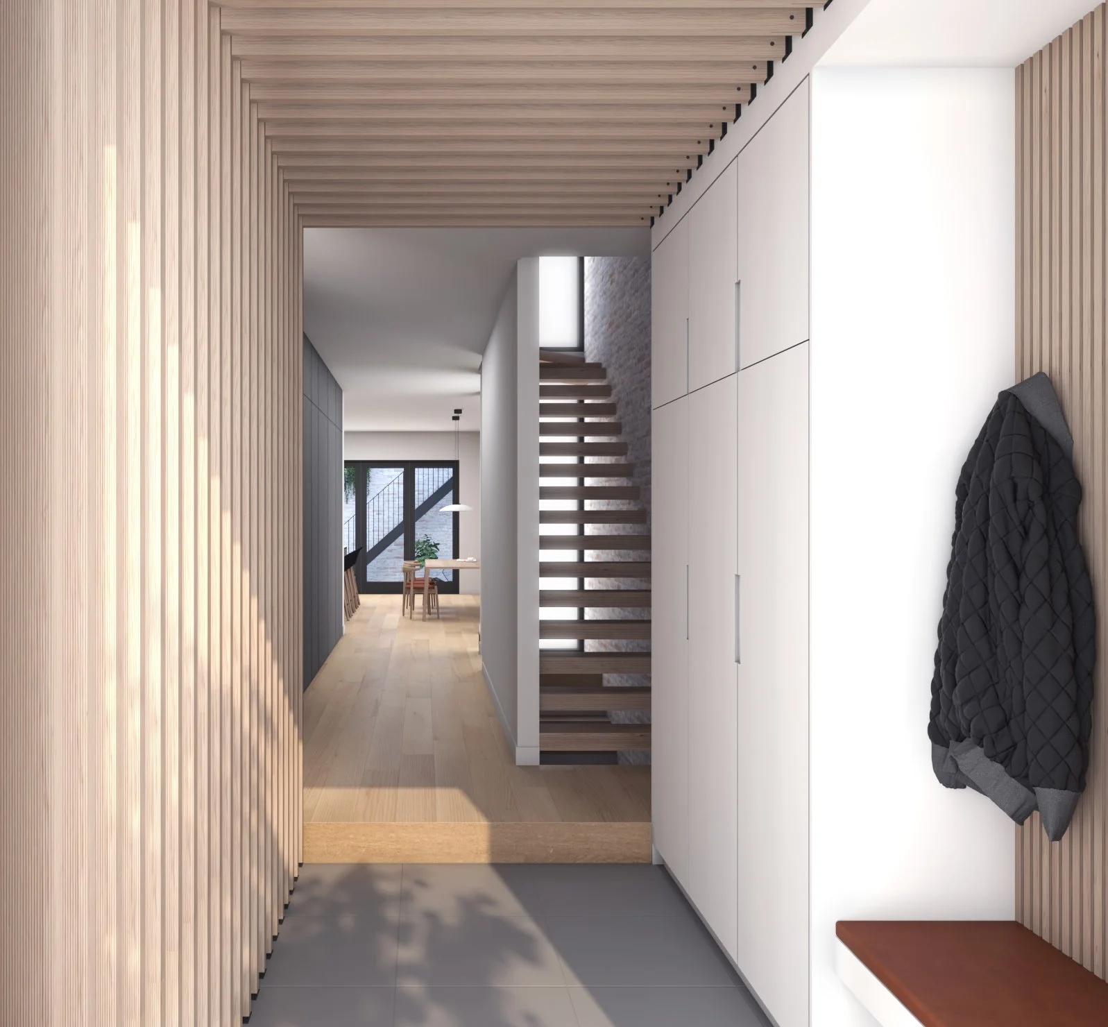 34-TEN jumped at the opportunity. The final design relies on custom fabrication and careful spatial sequencing. A prefabricated wood slat wall maintains privacy for the residential spaces when staff or visitors enter the home, while a translucent “lantern” light well draws daylight through an open riser stair and glows softly at night. Floor-to-ceiling glass walls line the window well, reinterpreting a classic strategy used in historic lot-line buildings to bring light deep into the interior.