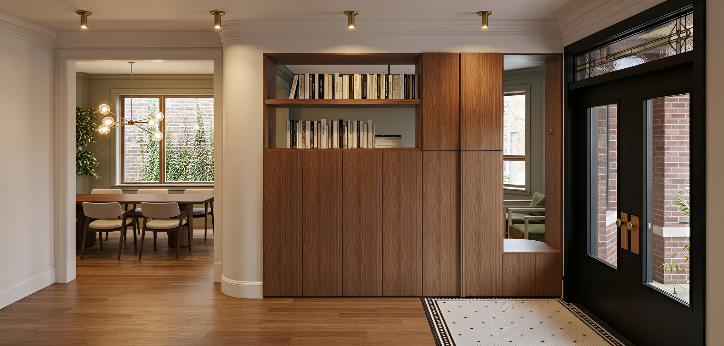 The first floor prioritizes cooking and gathering, with the kitchen occupying nearly half the plan and opening through large-format doors to a rear deck and yard. Original penny tile at the entry was preserved and paired with modern wood paneling, space for the family piano, and a dining banquette in warmer tones.